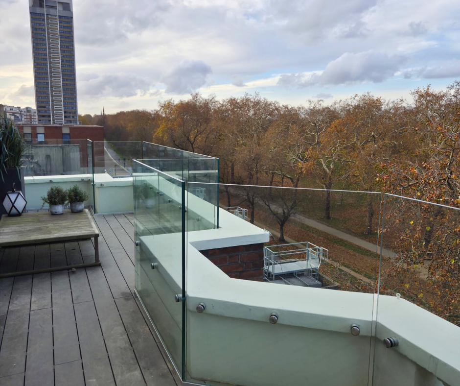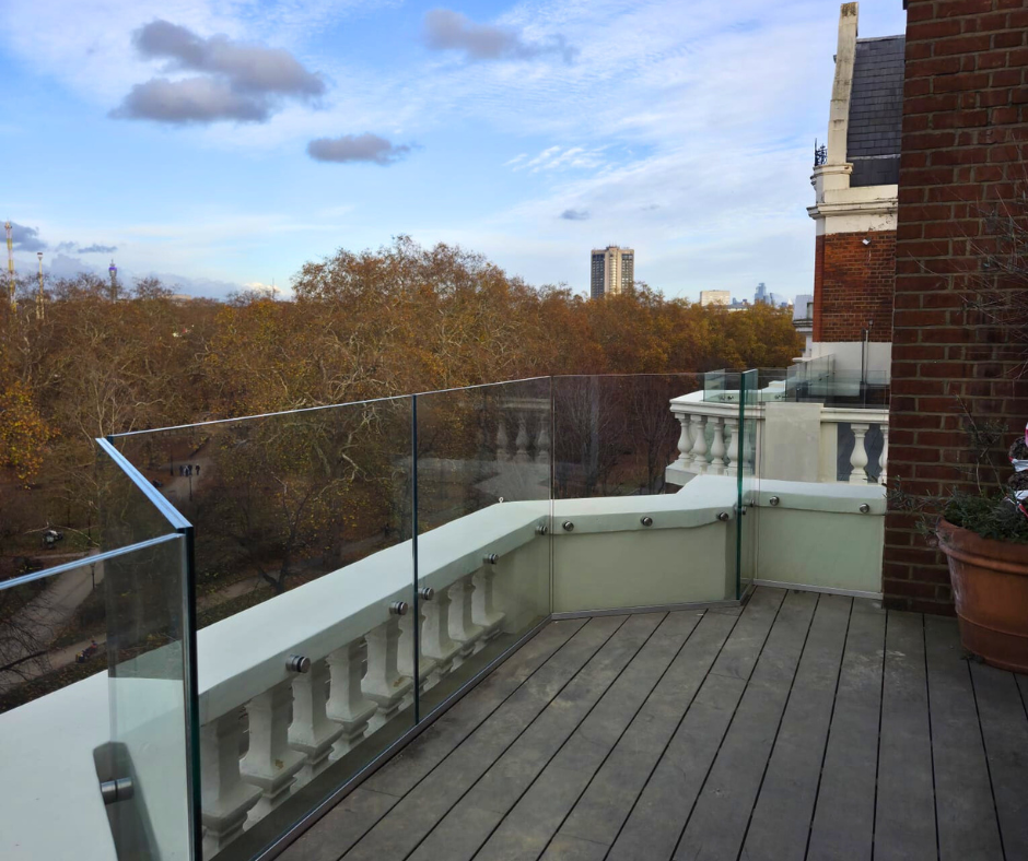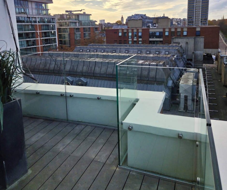 Our Solution: We supplied and fitted a sleek, frameless glass balustrade using 17.5mm toughened laminated glass, engineered to meet safety regulations while maintaining a barely-there visual impact. Every panel was tailored to fit the angular lines and stepped sections of the existing terrace structure, ensuring a precise, integrated finish.